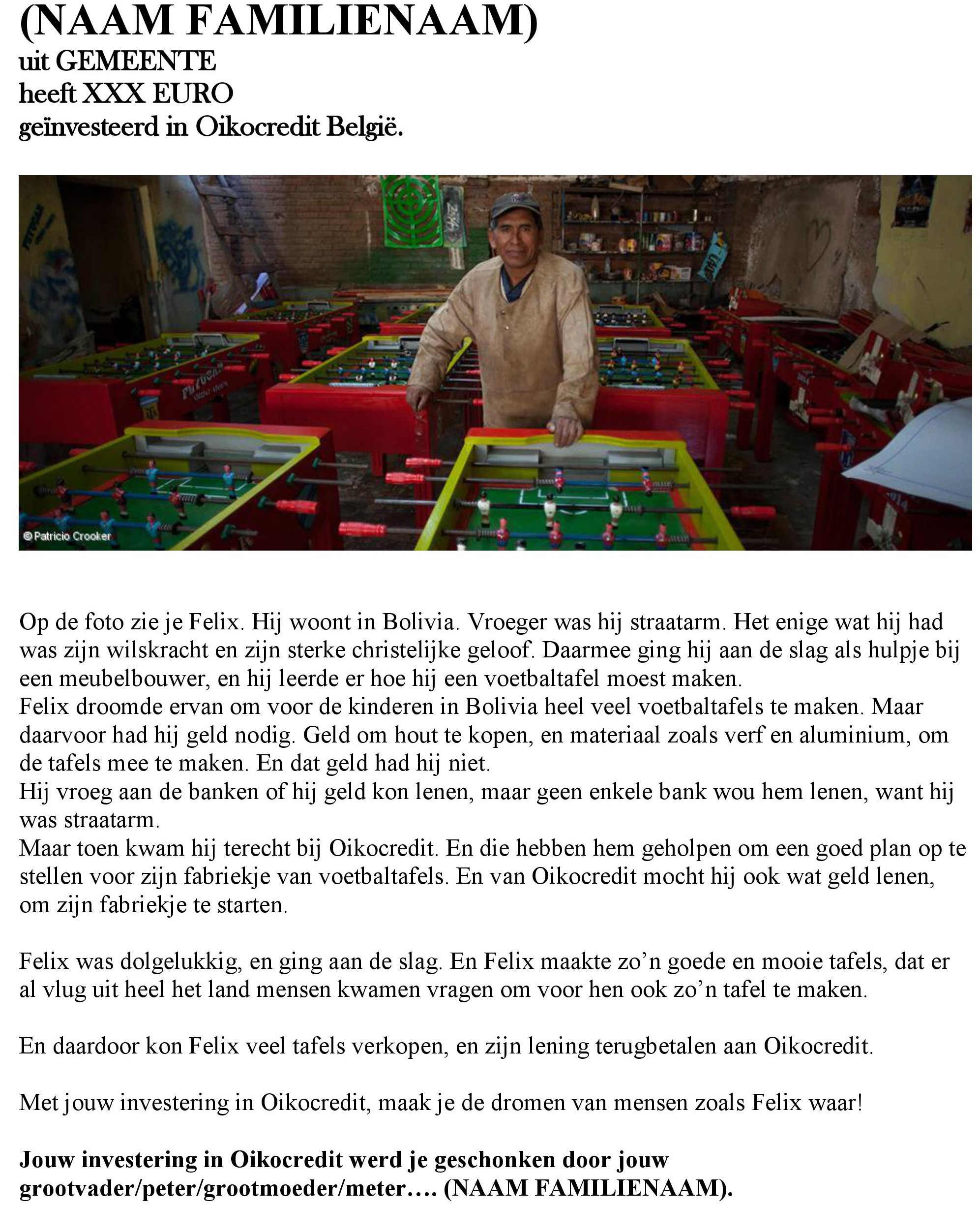 Bij Oikocredit vinden we een persoonlijke aanpak heel belangrijk. Daarom stellen wij graag een leuk aandelencertificaat op voor je (klein)kind dat je kan afgeven op de dag zelf. Daarop staat jouw naam en het bedrag vermeld dat je geïnvesteerd hebt voor jouw (klein)kind. Je kan op de afbeelding hiernaast klikken om het voorbeeldcertificaat uitvergroot te zien.