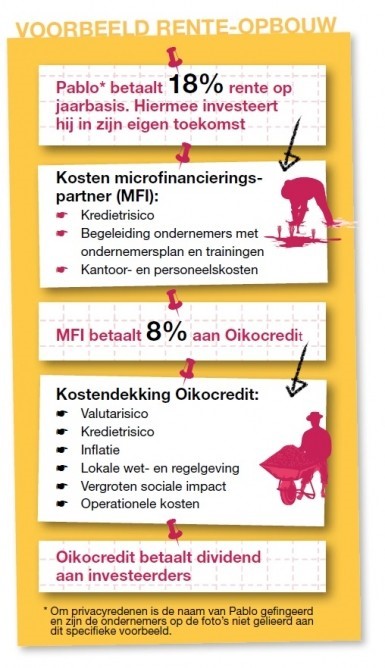Naast macro-economische factoren, spelen veel meer zaken mee die de opbouw van rentepercentages voor kredieten bepalen. Dit is afhankelijk van veel verschillende omgevingsfactoren. Bovendien zijn de omstandigheden in een ontwikkelingsland zijn niet te vergelijken met die in een welvarend land als België. Zo brengt het bijvoorbeeld meer kosten met zich mee om mensen in verafgelegen plattelandsgebieden te bereiken met een lening. Daarnaast duwt ook de lokale inflatie (soms wel meer dan 10%) de rente de hoogte in. Tenslotte dekt de rente eveneens de kosten van het advies en de begeleiding die ondernemers er krijgen. Vaak krijgen zij bijvoorbeeld trainingen om nóg succesvoller te ondernemen of ontvangen ze hulp bij het opstellen van hun businessplan. Ook zijn relatief kleine leningen aan beginnende ondernemers risicovoller en dus duurder. Toch zijn dat juist de mensen die Oikocredit wil bereiken.
