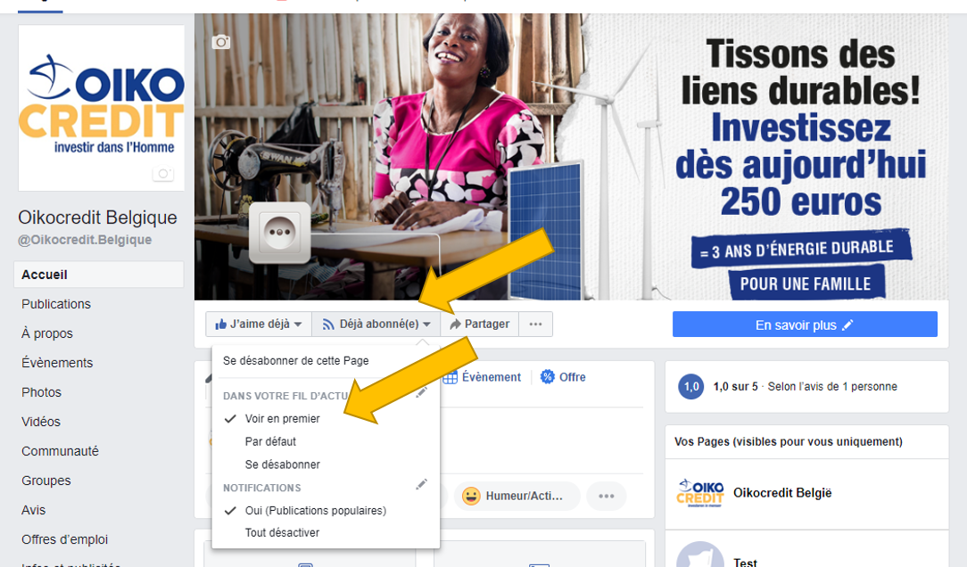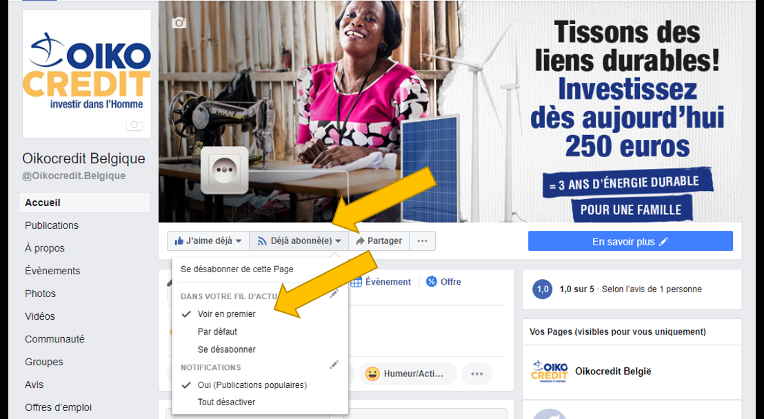Suivez le guide pour être certain.e de ne pas rater nos publications sur Facebook: https://www.facebook.com/Oikocredit.Belgique/ : « aimez » notre page ou abonnez-vous, cliquez sur « déjà abonné(e) » et ensuite sur « voir en premier ». Et vous aurez ainsi régulièrement de nos nouvelles !